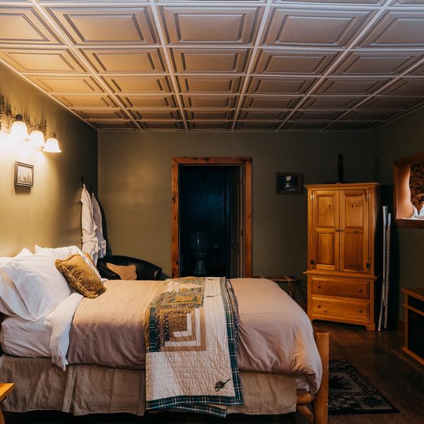 The Lodge Suite is a two-bedroom suite that sleeps up to 6 individuals. It has a queen bed in the main room with a full and two twins in the second bedroom. It is trimmed in rough sawn cedar and features a bath with a tub and shower combination.