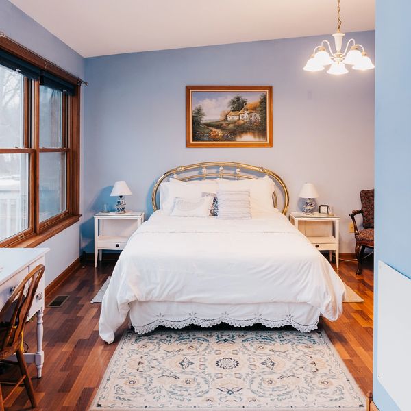 The Blue Room sleeps 2 in a queen bed and features a wall of south-facing windows overlooking the deck and back yard. Private bath with an oversized standup shower.